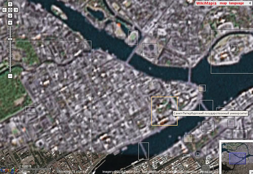 Сегодняшний наш герой — один из продуктов, которых бы просто не было без разработок Google, в данном случае — Google Maps. Итак, сегодня речь пойдет о WikiMapia. Этот сервис делает достаточно простую и очевидную вещь — позволяет пользователям добавлять описания любых объектов на карте. Т.е. вы можете описать любой предмет на карте. Пользователей в интернете много, так что при некоторой популярности проекта скоро по такой карте можно будет найти все сколь нибудь примечательные объекты. Итак, любой пользователь может выделить на карте объект и добавить к нему описание. По принципу это действительно напоминает wiki — совместная работа над описаниями, хранение промежуточных версий, возможность отката к предыдущему состоянию документа. На самом деле, при всей простоте и изящности идеи, ей, по моему крайне нескромному мнению, не хватает уровня реализации. Форма для выделения объекта может быть только прямоугольником, т.е. большинство объектов просто нельзя очертить хотя бы более-менее точно. Плюс, сейчас в описание объекта можно ставить только текст. Ни о каком wysiwyg с оформлением текста и вставками фотографий речи не идет. Что, на самом деле, очень и очень жаль. Иначе можно было бы составлять целые онлайновые экскурсии, с проработанным текстом, иллюстрациями и т.д. Достаточно странно реализован поиск — предположим, что я просматриваю карту Петербурга и хочу найти кафе. На мой взгляд достаточно логичным является поиск по тегу food или сafe. Беда в том, что в результатах поиска будут выведены объекты со всего света, которым сопоставлен данный тег. Безусловно, мне крайне интересно узнать, что где-то в Сан-Франциско есть кафе с замечательной кухней, но знаете, хотелось бы чего-то поближе.